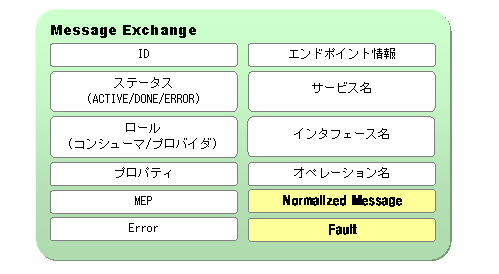 JBIのサービス間で交換するメッセージは、メッセージエクスチェンジ(Message Exchange)と呼ばれます。メッセージエクスチェンジには、そのメッセージの宛先、ノーマライズメッセージ、様々な処理に用いることが可能なプロパティなどの図3.3aに挙げたものが格納されています。メッセージの宛先は動的に変更することが可能となっており、宛先を柔軟に切り替えることができます。ステータスはメッセージエクスチェンジの状態を表しており、これによりメッセージエクスチェンジが「メッセージ交換方式(MEP)」で説明したシーケンスのどのステージにあるかを判断します。エンドポイント情報は、WSDL 1.1ではPortTypeインタフェースに相当します。