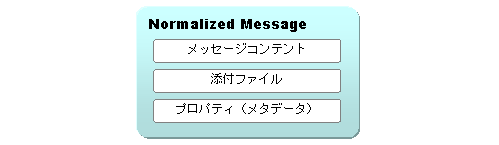 ノーマライズメッセージ(Normalized Message)は、サービス間でやり取りするメッセージの本文です。ノーマライズメッセージには、次のサービスへ伝達するXML文書が入るメッセージコンテントの他、添付ファイルとプロパティが含まれます。プロパティには、コンポーネントの処理で必要となるメッセージのヘッダのような付加情報を任意で追加できるほか、JBI仕様で予め規定されたセキュリティサブジェクト、プロトコルタイプ、プロトコルヘッダが格納されます。