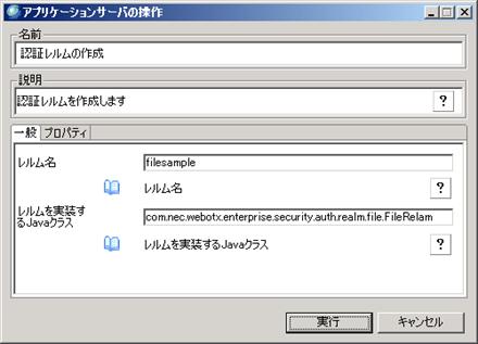 一般タブを選択し、レルム名に任意の名前を入力します。レルム名は任意に設定できます(本例ではfileとします)。また、クラス名にはcom.nec.webotx.enterprise.security.auth.realm.file.FileRealmを入力してください。
