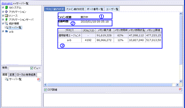ツリービューの「サーバ一覧」をクリックして、メインビューに「ドメイン動作状況」を選択した場合、ドメイン動作状況の画面を表示します。