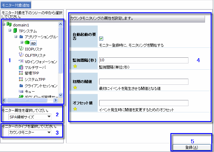 | 4 | モニターリング属性設定画面 | 登録したいモニターの各属性を設定します。選択されたモニタータイプにより設定値が異なります。 |