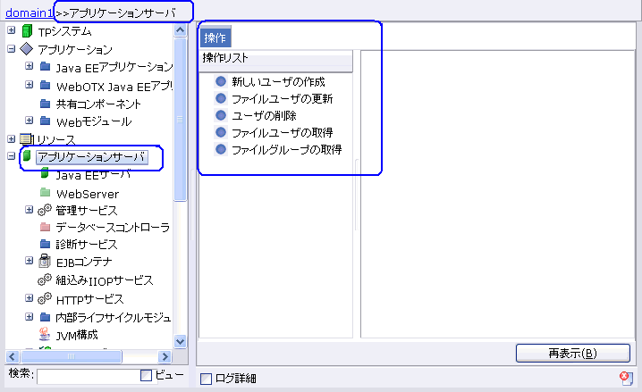 サーバから取得したドメインの構成情報をツリー形式でこの領域に表示します。ユーザドメインで管理されている全ての