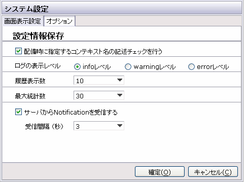 | 「サーバからNotificationを受信する」 | サーバからNotificationを受信する間隔(秒)を設定します。チェックを外した場合は定期的にNotificationを受信しませんが、何らかの操作を行ったタイミングではNotificationを受信します。 | 3 |