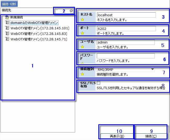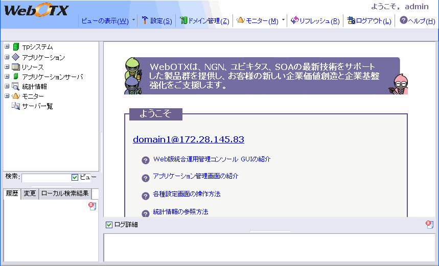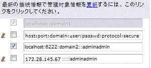 「ドメイン管理」ボタンによって、WebOTXの管理サーバを接続し、各ドメインを設定、操作することができます。詳しい内容は[1.8. ドメイン管理]を参照してください。