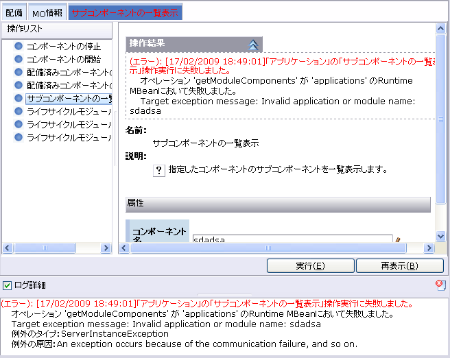 | ...の属性値取得時に例外が発生しました。 | ツリービューで選択したMBeanの属性の値を取得する際に、例外が発生しました。 |