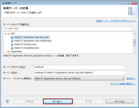 サーバーの設定を行っていない場合、WebOTXマニュアル1.2.4.1. WebOTXランタイムの設定 を参照の上、設定を行ってください。
