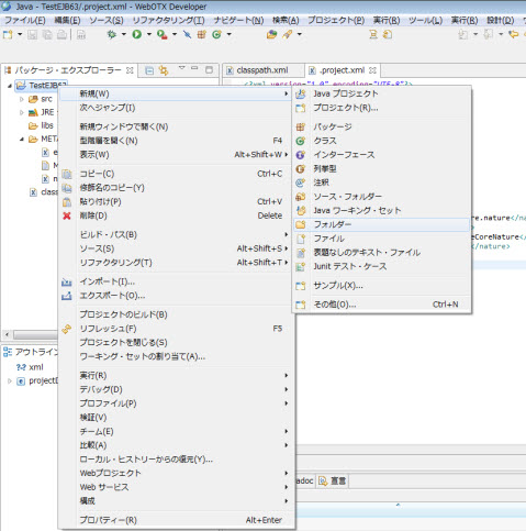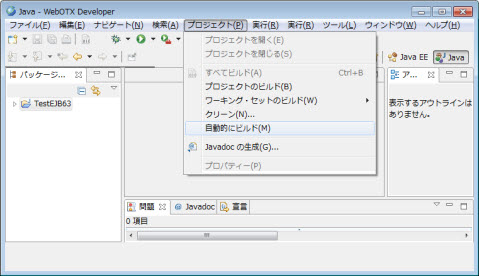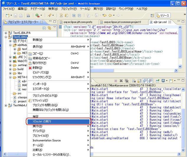 プロジェクト・エクスプローラーでTestEJB63の右クリックメニュー XDocletの実行