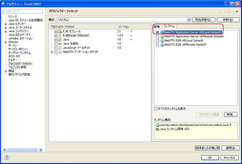 ランタイムタブをクリックして、対応するランタイム(例では、WebOTX