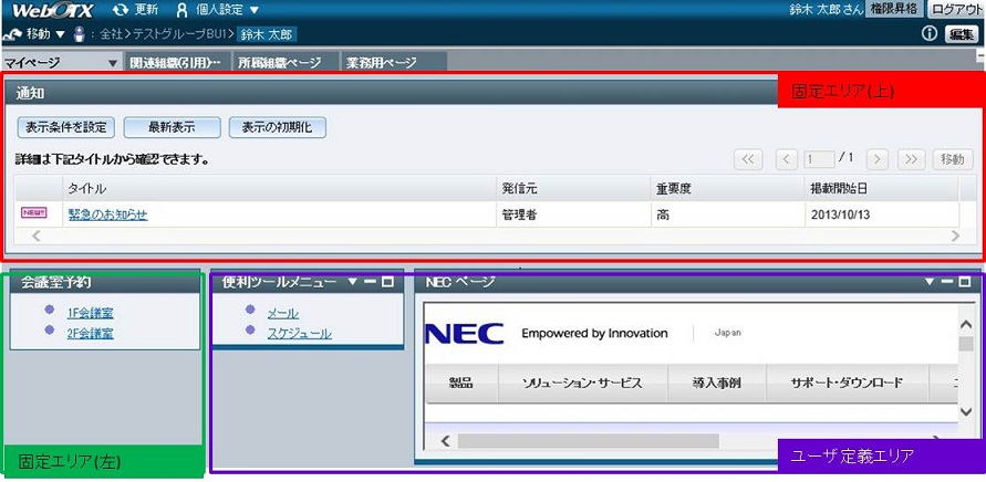 また、会社管理者が固定配置機能を利用することで上記に加え、固定エリアが表示されます。固定エリアと区別するために一般ユーザが編集可能な領域をユーザ定義エリアと呼びます。