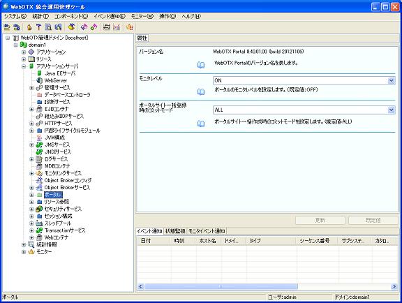 デフォルトの環境では、統計情報は採取しない設定になっています。統計情報の採取を行うには、以下の手順でWebOTX Portalが動作しているドメインに対して設定を行う必要があります。