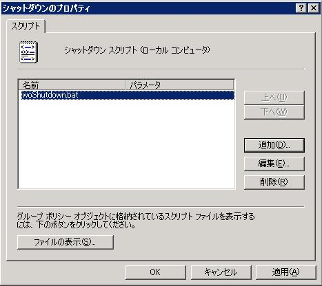 以下の一行を内容として含むスクリプトwoShutdown.batを作成し、C:\WINDOWS\system32\GroupPolicy\Machine\Scripts\Shutdownまたは環境に合わせた誤って削除されることのない場所に保存します。