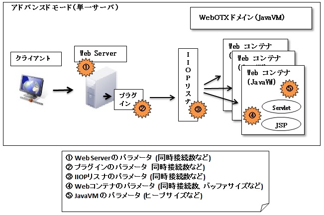 | スタンダードモード | WebOTX Webサーバ(Apache) | なし | server.resources.jdbc-datasource.{1}.connectRetryMax server.resources.jdbc-datasource.{1}.connectRetryInterval server.resources.jdbc-datasource.{1}.loginTimeout server.resources.jdbc-datasource.{1}.queryTimeout server.resources.jdbc-datasource.{1}.readTimeout server.resources.jdbc-datasource.{1}.waitFreeConnTimeout server.WebServer.MaxClients server.web-container.plugin-config.plugin-pool-size server.thread-pools.thread-pool.http-thread-pool.max-thread-pool-size httpd.confに設定されたServerLimit httpd.confに設定されたThreadsPerChild |