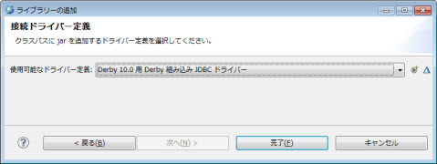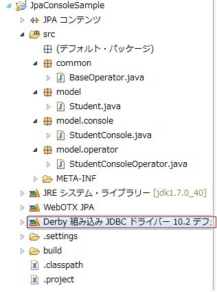 再度、データベースのドライバーを追加する必要はありません。その場合、プロジェクト・ツリーに、Derby