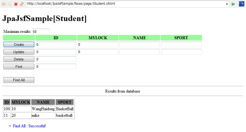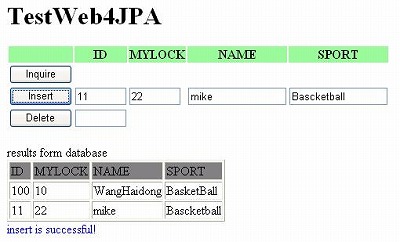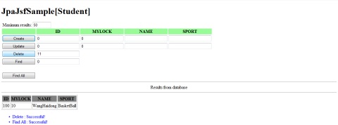 result(id=100):<?xml version="1.0" encoding="UTF-8" standalone="yes"?><student><id>100</id><mylock>10</mylock><name>WangHaidong</name><sport>BasketBall</sport></student> After Create(id=40,id=60), result(all):<?xml version="1.0" encoding="UTF-8" standalone="yes"?><students><student><id>100</id><mylock>10</mylock><name>WangHaidong</name><sport>BasketBall</sport></student><student><id>40</id><mylock>20</mylock><name>Shirley</name><sport>Dance</sport></student><student><id>60</id><mylock>30</mylock><name>Akasha</name><sport>Pain</sport></student></students> After Update(id=40), result(all):<?xml version="1.0" encoding="UTF-8" standalone="yes"?><students><student><id>100</id><mylock>10</mylock><name>WangHaidong</name><sport>BasketBall</sport></student><student><id>40</id><mylock>30</mylock><name>Valentine</name><sport>CQB</sport></student><student><id>60</id><mylock>30</mylock><name>Akasha</name><sport>Pain</sport></student></students> result(0~1):<?xml version="1.0" encoding="UTF-8" standalone="yes"?><students><student><id>100</id><mylock>10</mylock><name>WangHaidong</name><sport>BasketBall</sport></student><student><id>40</id><mylock>30</mylock><name>Valentine</name><sport>CQB</sport></student></students> After Delete(id=40,id=60), result(all):<?xml version="1.0" encoding="UTF-8" standalone="yes"?><students><student><id>100</id><mylock>10</mylock><name>WangHaidong</name><sport>BasketBall</sport></students> succeed