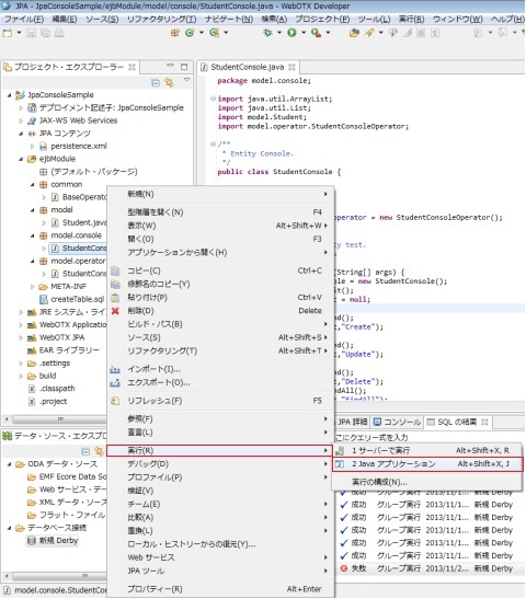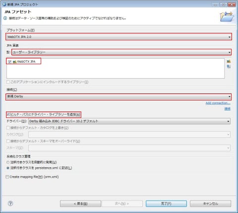 コンソールアプリケーションの作成ウィザード等で、既にDB接続を設定している場合、再度、persistence.xmlへDB接続を設定する必要はありません。その場合、次の[10.1.2.5. ビルド・パスの変更及びライブラリーの追加]の節に進んでください。