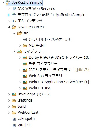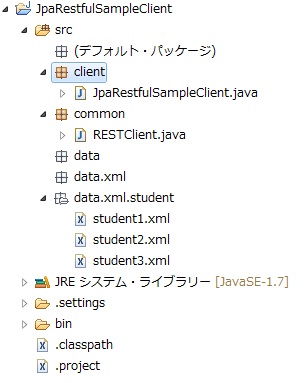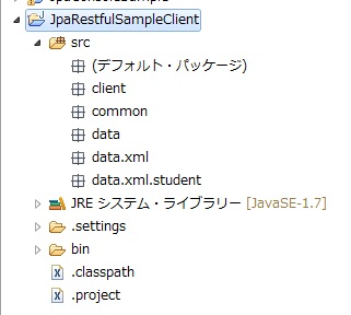 <?xml version="1.0" encoding="UTF-8" standalone="yes" ?> <student> <id>60</id> <mylock>30</mylock> <name>Akasha</name> <sport>Pain</sport> </student>作成完了のJpaRestfulSampleClientプロジェクトは以下のようです。