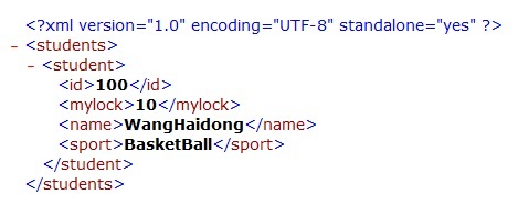 <?xml version="1.0" encoding="UTF-8" standalone="yes" ?> <student> <id>40</id> <mylock>20</mylock> <name>Shirley</name> <sport>Dance</sport> </student>student2.xmlというxmlファイルを作成し、その内容は以下ようにします。