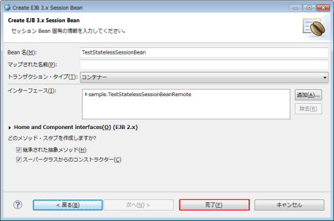 クラス名にTestStatelessSessionBeanを入力して、