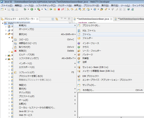 StatelessBeanSample (※ステートフルの場合:StatefulBeanSample、Singletonの場合:SingletonBeanSample) プロジェクトの右クリックメニュー新規 > ファイルを選択します。