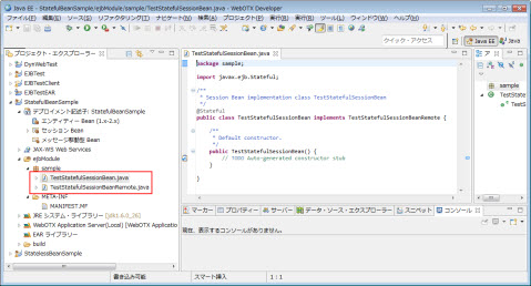 次にsampleパッケージ配下にTestSingletonSessionBeanRemote.javaとTestSingletonSessionBean.javaファイルが追加されていることを確認します。