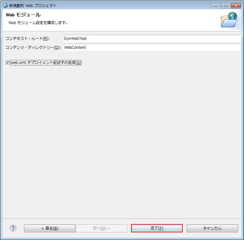 表示されたWeb モジュール 画面に 完了 をクリックすると、プロジェクトDynWebTestが作成されます。