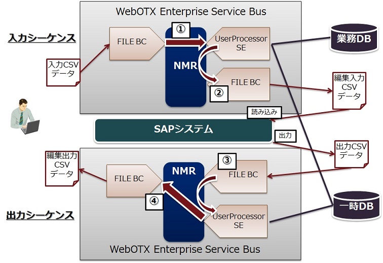 出力シーケンスの場合、SAPシステムから出力されたCSVファイルをFile BCで受け、UserProcessor SEで入力シーケンス