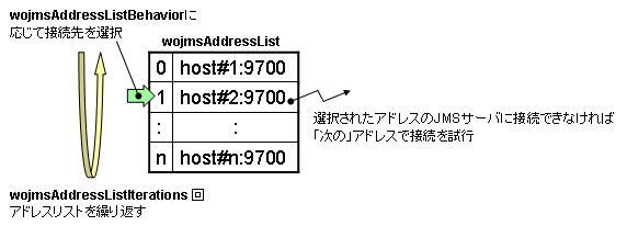 JMSクライアントランタイムは、wojmsAddresListBehaviorの設定に応じて、wojmsAddressListから接続先を選択し接続を行います。最初に選択したアドレスで接続できなかった場合は、wojmsAddressListから「次の」アドレスを選択して接続を試みます。それでも接続できなければ「次の」アドレス、と進めていき、wojmsAddressListIterations回アドレスリストを繰り返して接続できなければ、例外を発生させるようになっています。