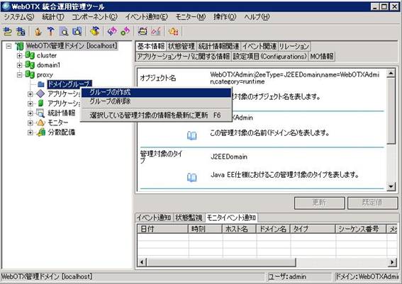 統合運用管理ツールの「Proxy」-「ドメイングループ」を右クリックして表示される操作の一覧から「グループの作成」を選択します。ドメイングループの作成について詳細は次の箇所を参照してください。