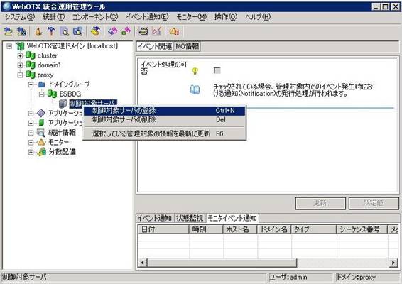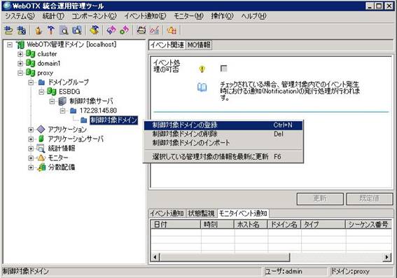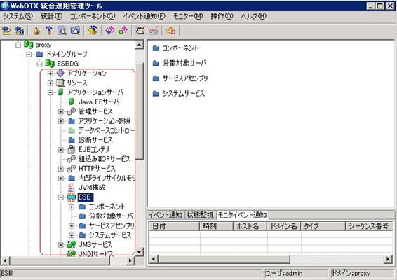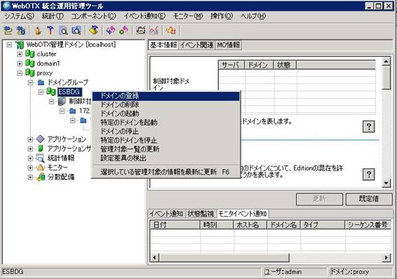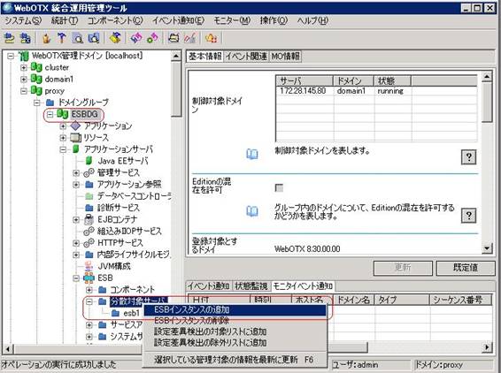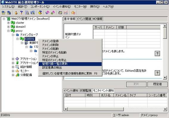 ドメイングループを右クリックして表示される操作の一覧から「管理対象一覧の更新」を選択します。更新後、ドメイングループの下に「アプリケーション」ノード、「リソース」ノード、「アプリケーションサーバ」ノードを生成します。「アプリケーションサーバ」ノードを展開すると「ESB」ノードが表示されます。