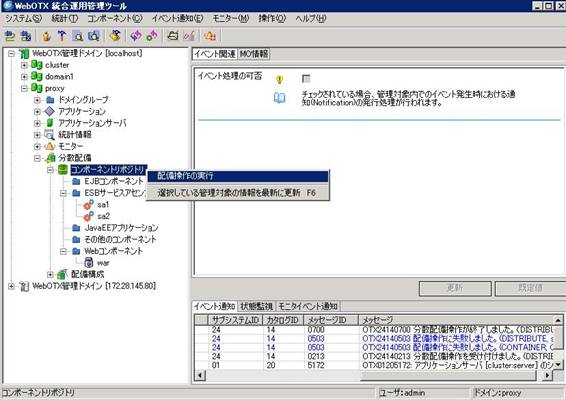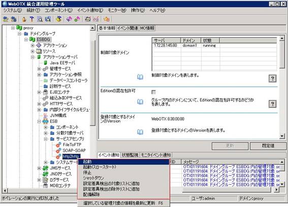 ドメイングループのESBからサービスアセンブリを選択し、右クリックして表示される操作から該当サービスアセンブリの起動、停止、シャットダウン、配備解除を実行できます。