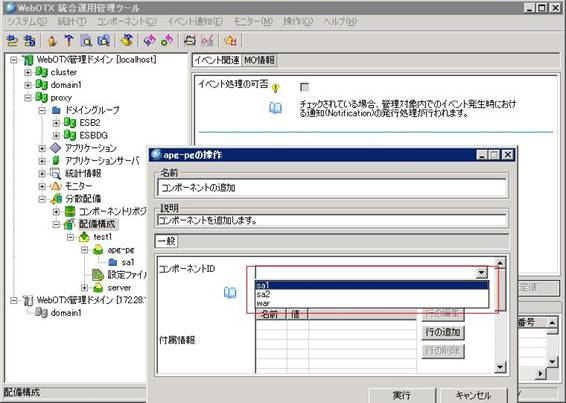 ・作成した「サーバ」の「コンポーネントの追加」メニューで配備するサービスアセンブリを追加します。サーバごとにサービスアセンブリを追加する必要があります。