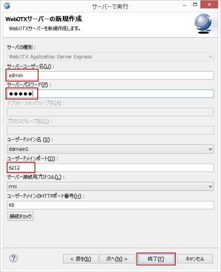 サーバーユーザー名、サーバーパスワードを入力し、ユーザードメインポート を確認して、 終了
