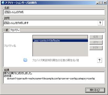 2の設定を行うことで使用するレルムを変更することができます。レルムの設定を完全に削除する場合は次の手順を行ってください。[domain1]-[アプリケーションサーバ]-[セキュリティサービス]を右クリックし、[認証レルムの削除]を選択してください。レルム名に削除するレルムの名前(本例ではfilesample)を入力し、[実行]ボタンをおしてください。