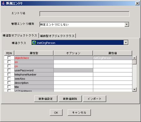新規エントリ画面では構造クラスには、groupOfUniqueNamesを必ず指定してください。また、以下の属性値は必ず指定してください。