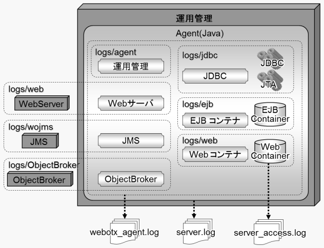 運用管理(webotx_agent.log, server.log、server_err.log, agent_operation.log, webotx_prcstop.log) Webコンテナ(server_access.log) |