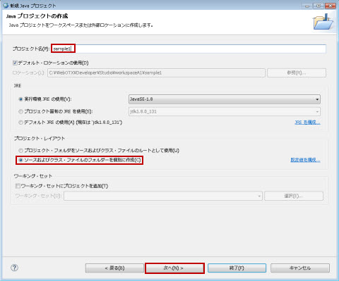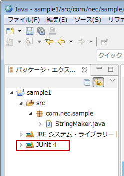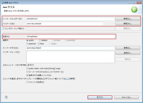 まず新規のソースファイルを作成します。以下ではソースフォルダのsampleパッケージにTest2.javaを追加します。
