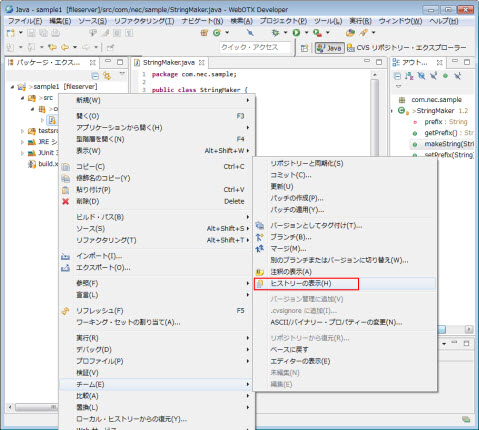 ファイルの修正履歴を確認することができます。パッケージ・エクスプローラで履歴を確認したいファイルを選択し右クリックメニュー [チーム] > [ヒストリーを表示] を選択します。