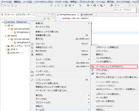 SVNリポジトリビューでフォルダ[trunk]を選択し、右クリックメニュー [チーム] > [タグ] を選択します。