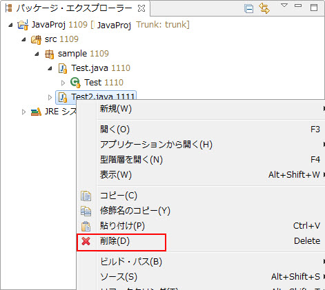 以下[削除の確認]ダイアログが表示されるので[OK]を押して、ワークスペースからファイル[Test.java]を削除します。