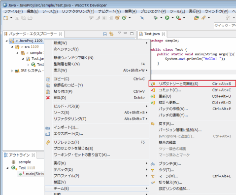 ファイルの修正を行いコミットする例を示します。ここではSVNサーバからチェックアウトを行ったJavaProjプロジェクトのTest.javaに修正を加えてコミットを行う例を示します。