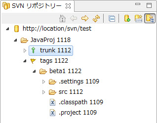 SVNリポジトリビューで新しく作成したタグのフォルダが作成されたことが確認できます。ここではtrunkフォルダのリソースがtags\beta1フォルダにコピーされることが確認できます。