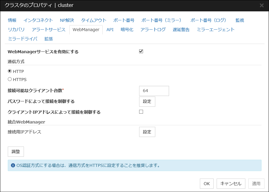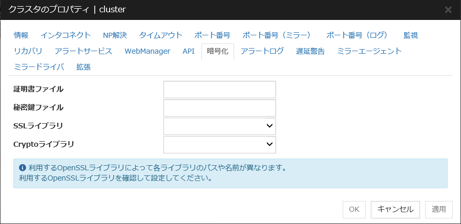 使用するライブラリを変更する場合は、クラスタプロパティの暗号化タブで [SSLライブラリ] および [Cryptoライブラリ] を設定してください。