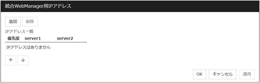 インタコネクトを複数設定する場合、[優先度] 列の番号が小さい通信経路が優先的にクラスタ サーバ間の内部通信に使用されます。優先度を変更する場合は、矢印をクリックして、選択行の順位を変更します。
