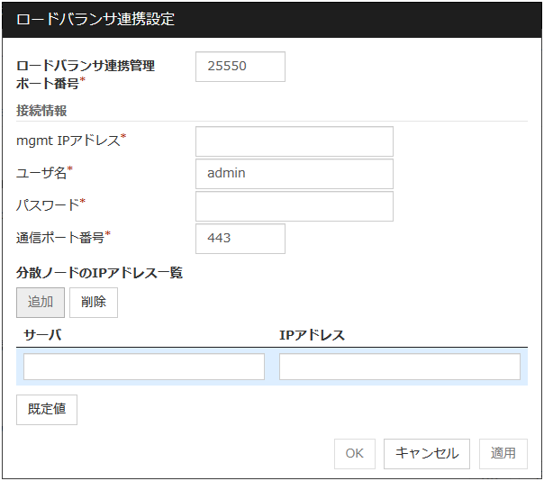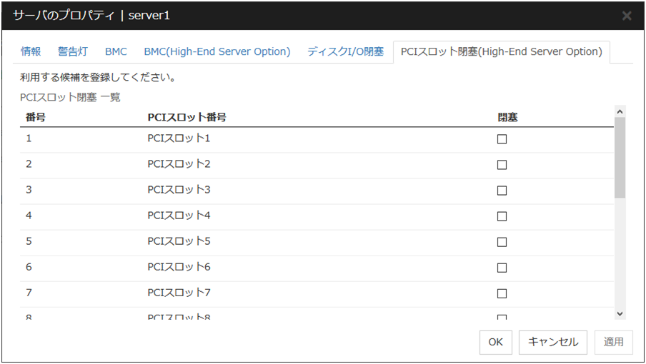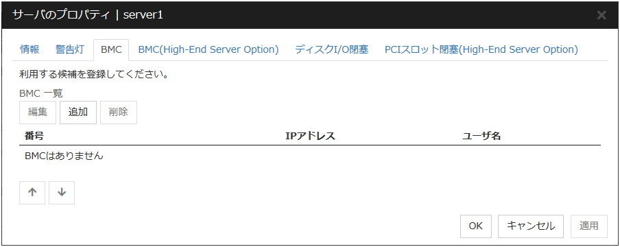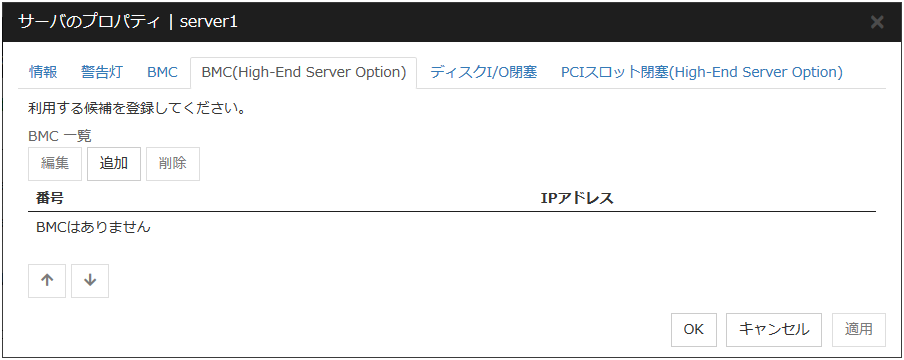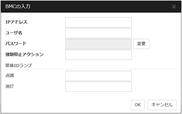 カーネルモード、ユーザモード、ミラー通信専用IP アドレスを入力します。使用しない通信経路は空欄にします。 DISKディスクデバイスを入力します。DISK デバイスを使用しない場合は空欄にします。 COMCOM デバイスを入力します。COM デバイスを使用しない場合は空欄にします。 BMCBMC の IP アドレスを入力します。BMC を使用しない場合は空欄にします。 Witness[使用する]、[使用しない] より選択します。注釈