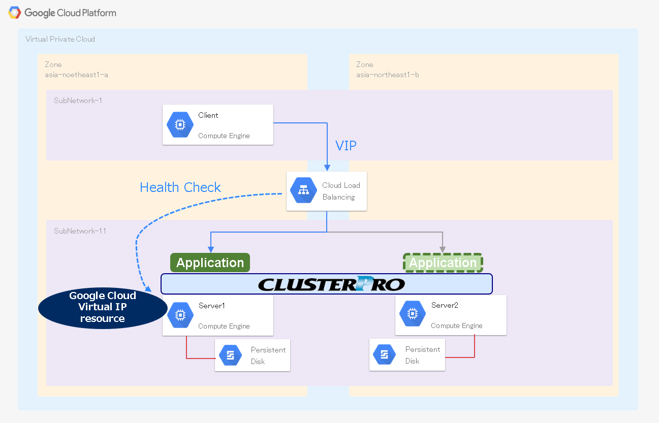 上記図の Google Cloud Platform 環境上に構築したクラスターには、VIP と外部から通信するためのポート、または DNS 名と外部から通信するためのポートを指定してアクセスします。 クラスターの現用系と待機系は、CLUSTERPRO から Google Cloud Platform のロードバランサ(上記図の Cloud Load Balancing)を制御して切り替えます。制御には上記図の、Health Check を利用します。