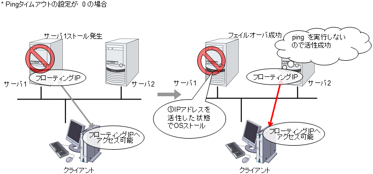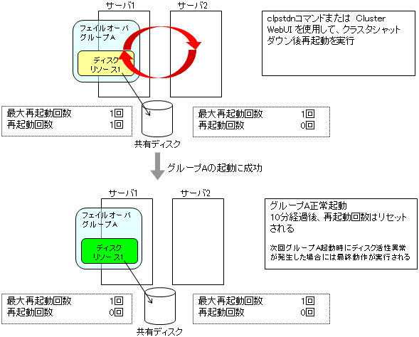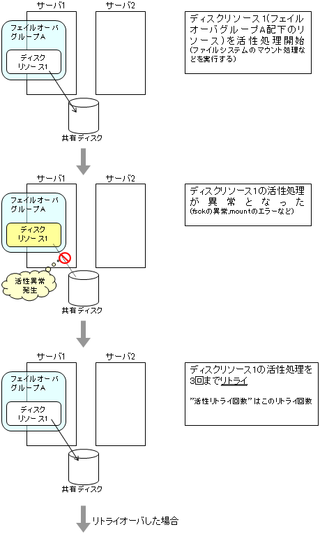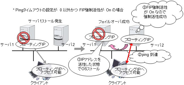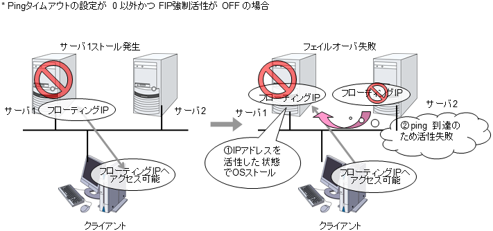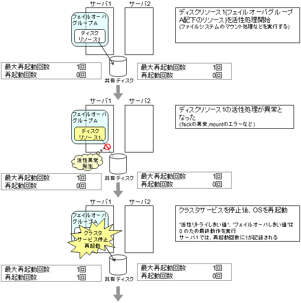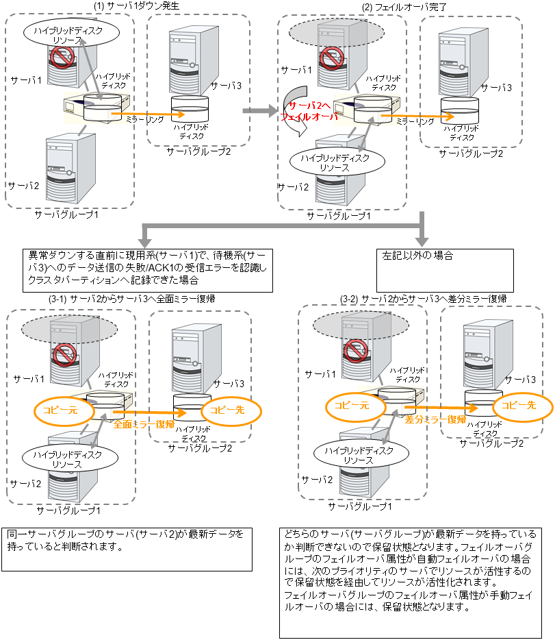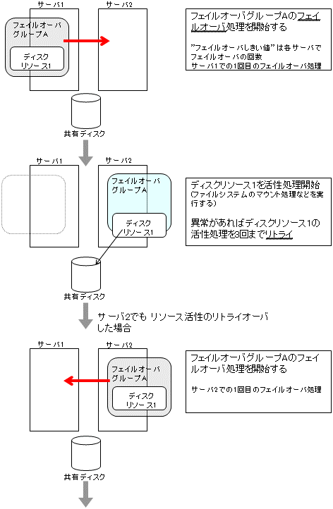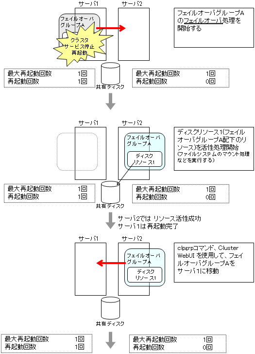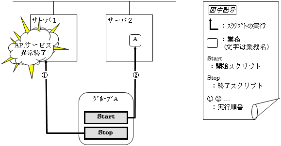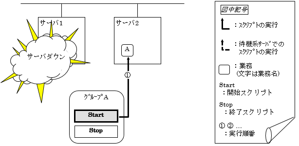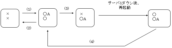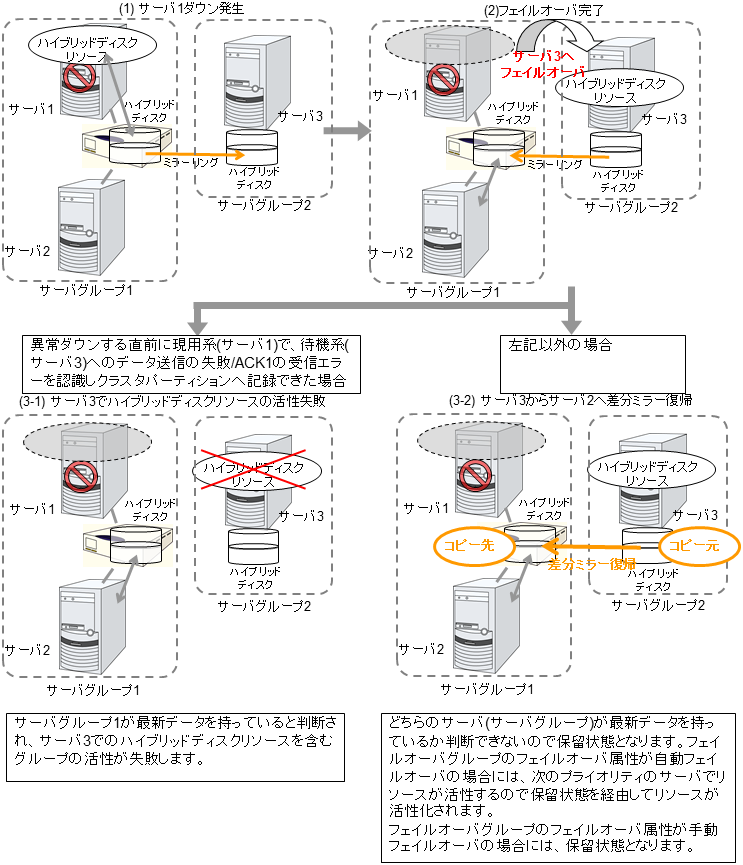 ハートビートがタイムアウトした場合、グループリソースやモニタリソースが異常を検出した場合、それらを契機に自動でフェイルオーバを行います。 自動フェイルオーバの場合、下記の方法を設定することができます。
