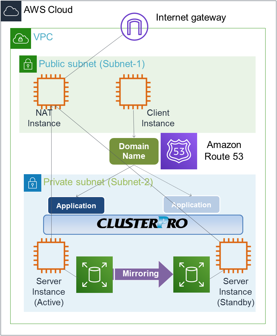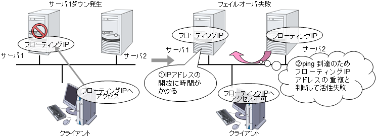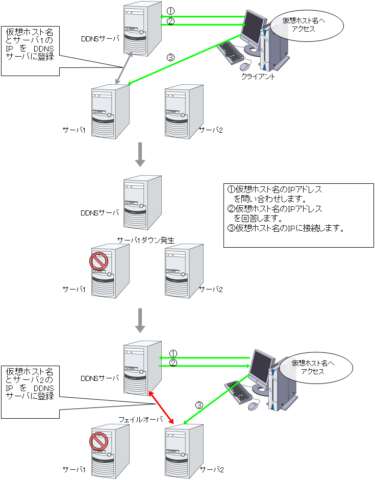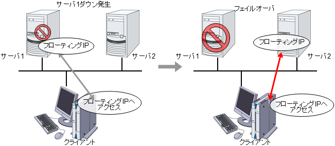 クライアントはフェイルオーバグループが起動しているノードに仮想ホスト名(DNS 名)でアクセスすることができます。