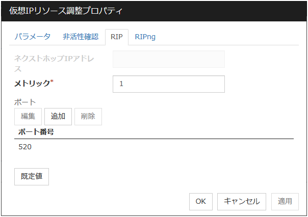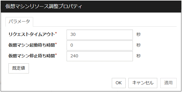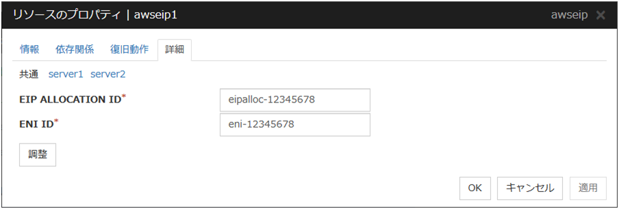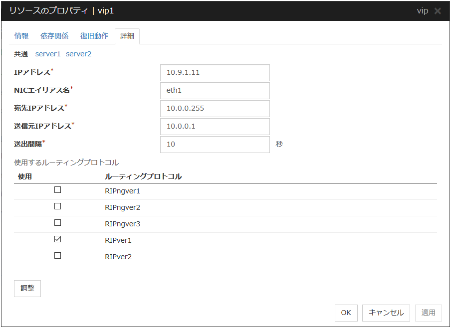 [Oracle Cloud 仮想 IP リソース調整プロパティ] ダイアログボックスを表示します。Oracle Cloud 仮想 IP リソースの詳細設定を行います。
