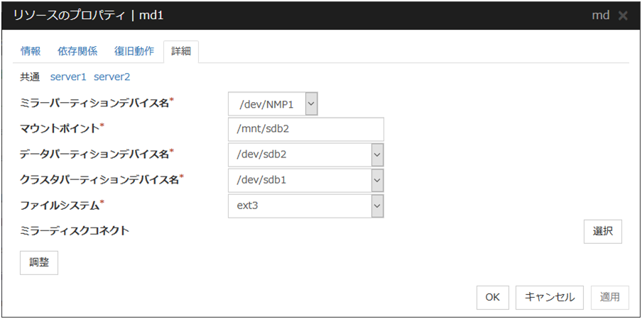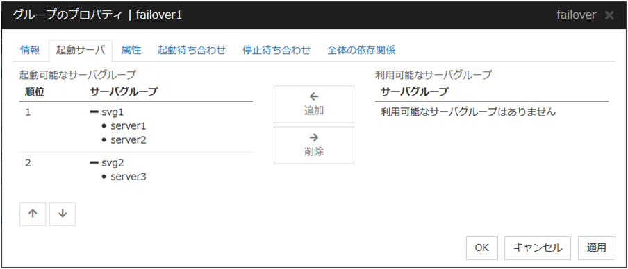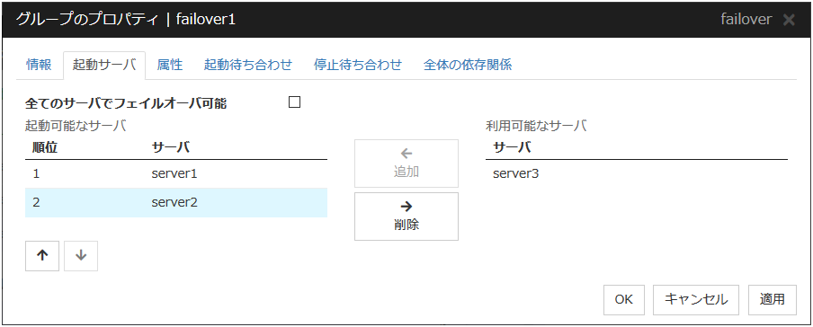 - 起動可能サーバクラスタを構成するサーバからグループが起動可能なサーバを選択し設定します。また、起動可能なサーバに順位を設定し、グループが起動する優先順位を設定します。