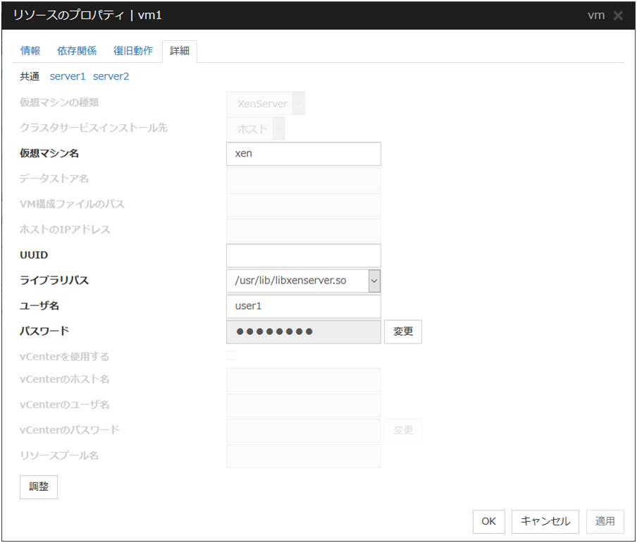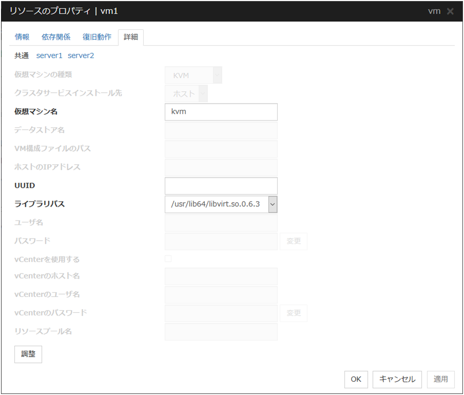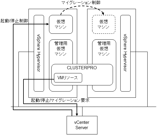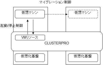 - 仮想マシングループ仮想マシンを単位としてフェイルオーバ (マイグレーション) を行います。このグループには 仮想マシンリソースのみ、ミラーディスクリソース、ディスクリソース、ハイブリッドディスクリソース、EXECリソース、NASリソース、ボリュームマネージャリソースが登録可能です。仮想マシングループは、CLUSTERPRO 以外の機能によって別サーバに仮想マシンが移動された場合でも、自動的に追随します。